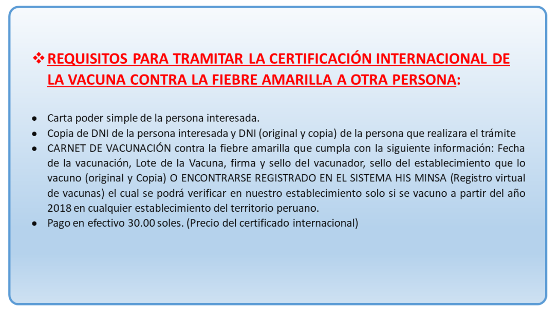 REQUISITOS PARA TRAMITAR LA CERTIFICACIÓN INTERNACIONAL DE LA VACUNA CONTRA LA FIEBRE AMARILLA A OTRA PERSONA