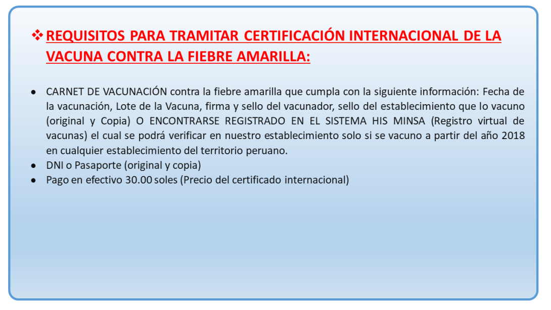 REQUISITOS PARA TRAMITAR CERTIFICACIÓN INTERNACIONAL DE LA VACUNA CONTRA LA FIEBRE AMARILLA: