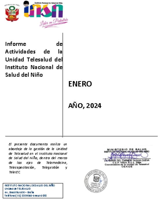 Documento ENERO_2024_con sello_INFORME DE ACTIVIDADES DE LA UNIDAD DE TELESALUD INSN - copia.pdf Fecha de Publicación Mié, 31/01/2024 - 12:00 Tipo Info Telesalud Telesalud Tipo Info Telesalud sub Informes