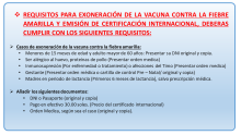 REQUISITOS PARA EXONERACIÓN DE LA VACUNA CONTRA LA FIEBRE AMARILLA Y EMISIÓN DE CERTIFICACIÓN INTERNACIONAL, DEBERAS CUMPLIR CON LOS SIGUIENTES REQUISITOS Lee más sobre REQUISITOS PARA EXONERACIÓN DE LA VACUNA CONTRA LA FIEBRE AMARILLA Y EMISIÓN DE CERTIFICACIÓN INTERNACIONAL, DEBERAS CUMPLIR CON LOS SIGUIENTES REQUISITOS